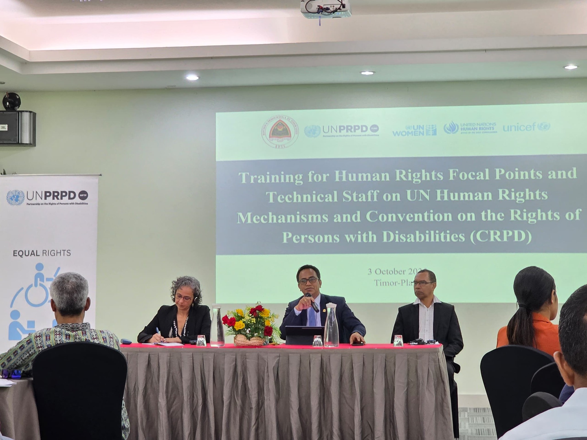 DILI,MJ-Sesta-Feira 03 Outubru 2025 Sua-Eselénsia Ministru Justisa, Dr. Sérgio de Jesus Fernandes da Costa Hornai, hamutuk ho ofisiál Koordenadora Rezidente ONU, iha Timor-Leste, Laura Lima no Diretór Jerál Polítika Justisa, Honorio Aureliano Soares Magalhães hala’o abertura programa formasaun pontu fokál Direitu Humanus ba Liña Ministériál sira, realiza formasaun iha Maubara Room, Timor-Plaza, Díli.