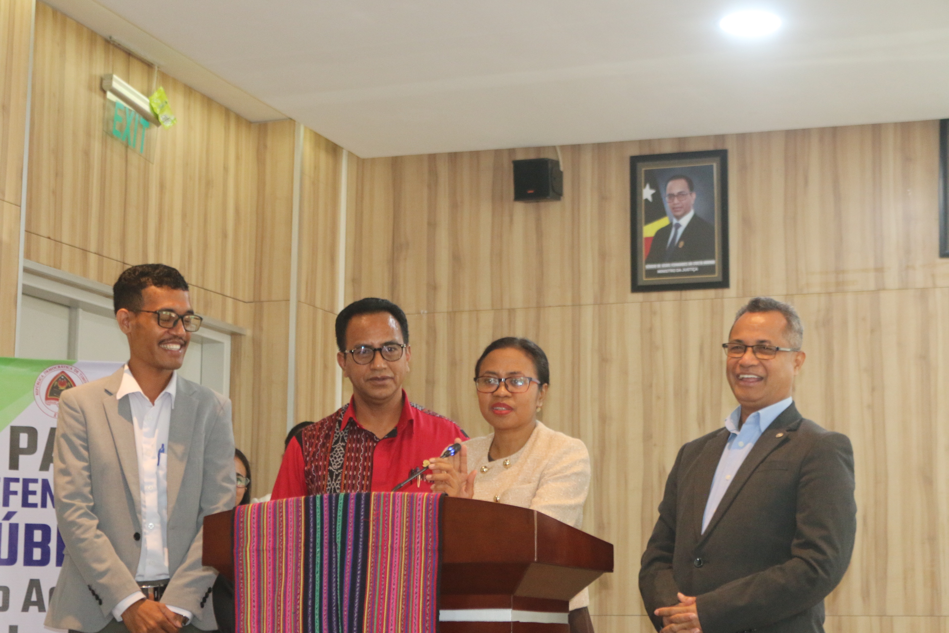 DILI,MJ-Sesta-Feira 19 Setembro 2025 Governu, liuhosi Sua-Eselénsia Ministru Justisa, Dr. Sérgio de Jesus Fernandes da Costa Hornai, hamutuk ho Sua-Eselénsia Sekretária Estadu Igualdade, Elvina de Sousa Carvalho, hala’o desiminasaun kona-ba tema “Papel Defensor iha Asesu ba Justisa iha Timor-Leste”, ne’ebé realiza iha edifísiu Ministériu Justisa, Colmera, Díli.