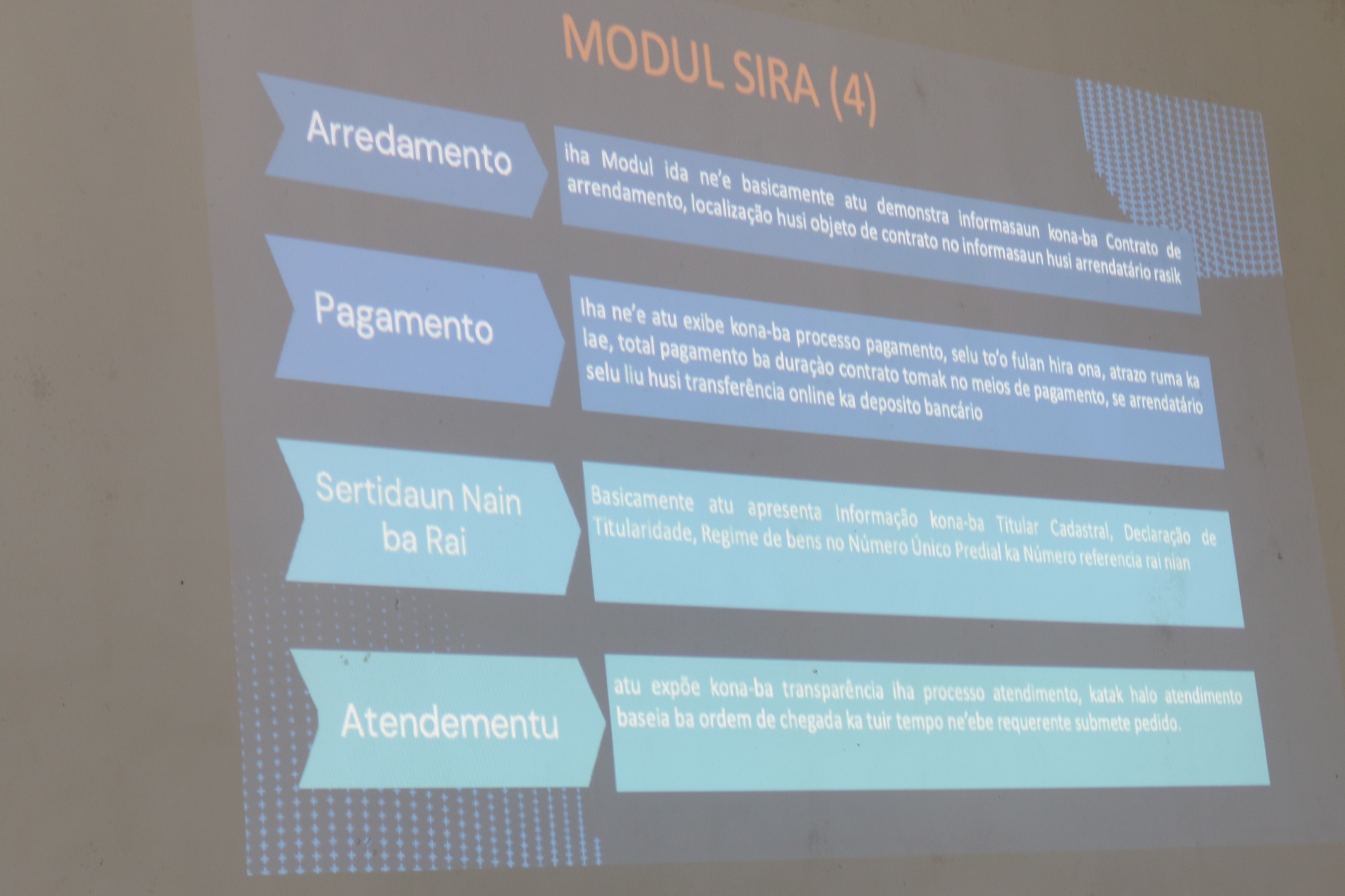 Objetivu hosi enkontru ne’e, atu halo avaliasaun sistema dijitál iha área Ministeriu justisa, liu-liu iha DGTP, no mós atu fortifika dezenvolvimentu no modernizasaun sistema sira ne’ebé eziste, hodi asegura efisiénsia, transparénsia no kualidade servisu justisa, tuir prinsipiu boa governasaun.