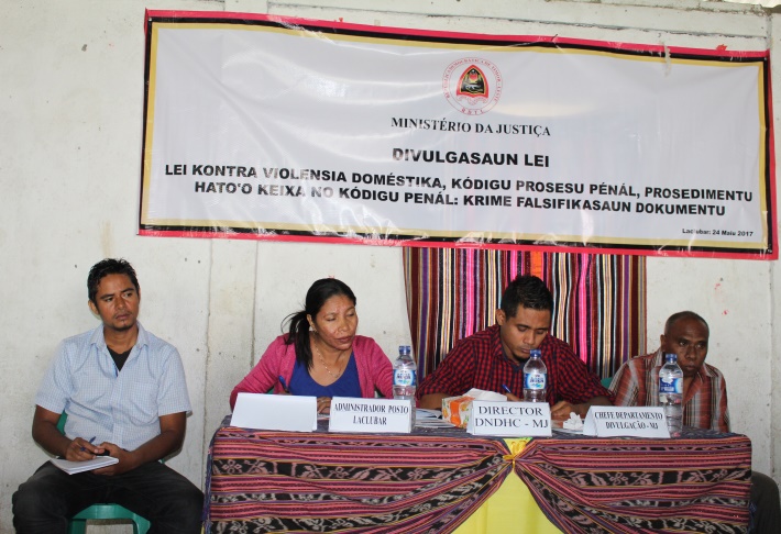 Iha sesaun abertura Diretur DNDHC hateten, “programa divulgasaun lei ne’e hala’o bazeia ba Planu Asaun Annual 2017 Ministeriu Justisa. Tinan tinan DNDHC hala’o programa divulgasaun lei iha nivel munisipiu no postu administrativu, iha nivel munisipiu iha Timor laran tomak realiza hotu ona divulgasaun no agora konsentra ba postu administrativu no suku sira, Iha Munisipiu Manatuto divulgasaun lei hala’o hotu ona iha postu administrativu, no hela postu administrativu Laklubar mak sedauk no ohin loron ita realize, divulgasaun lei ne’e ho objetivu atu hasa’e konesementu komunidade sira nia konaba lei hirak ne’ebé importante tamba ne’e mak ami sei fahe informasaun konaba Lei kontra violensia domestika, krime falsifikasaun dokumentus, krime eleitoral no prosedimentu hato’o keixa.Iha fatin mak hanesan, Reprezenta Administrador Postu Laklubar, Fernando Valentin hateten, “ami agradese ba Ministeriu Justisa liu husi Diretur ho komitiva sira tamba bele mai iha Laklubar hodi divulga lei sira, ho nune’e ami nia komunidade bele hatene liu tan konaba lei sira hodi nune’e bele halo tuir buat ne’ebe lei bandu hanesan labele halo krime iha uma laran, labele falsifika dokumentus, labele halo aktu ne’ebe sai hanesan krime elitoral.”