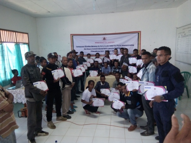 Hafoin remata formasaun partisipante sira simu sertifikadu ne’ebé prepara husi Ministeriu Justisa. Iha sesaun entrega sertifikadu ne’e asiste husi Reprezentante Administrador Postu, no Komandante Eskuadra PNTL. Formasaun ne’e Partisipa hosi autoridade lokal sira mak hanesan Chefe Suco no Chefe Aldeia, Lider Komunitaria, Professores sira, membru PNTL, Juventude, Lia Nain, parte Igreja, Funsiunariu publiku no Mediku sira, ne’ebé partisipante ba sesaun rua ne’e hamutuk ema nain 80, Formasaun ne’e interaktivu tebes tamba partisipante sira ativu hodi husu perguntas.**