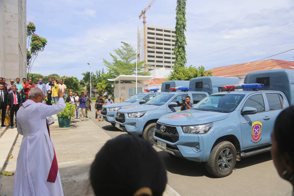 Iha serimónia entrega kareta tolu ne’e, Padre kapelaun Prizaun Bekora, Pe. Francisco Barreto hasa’e orasaun tuir sarani katólika no mós fó bensaun ba kareta estabelesimentu Prizionál Bekora, Ermera no Suai ne’e.