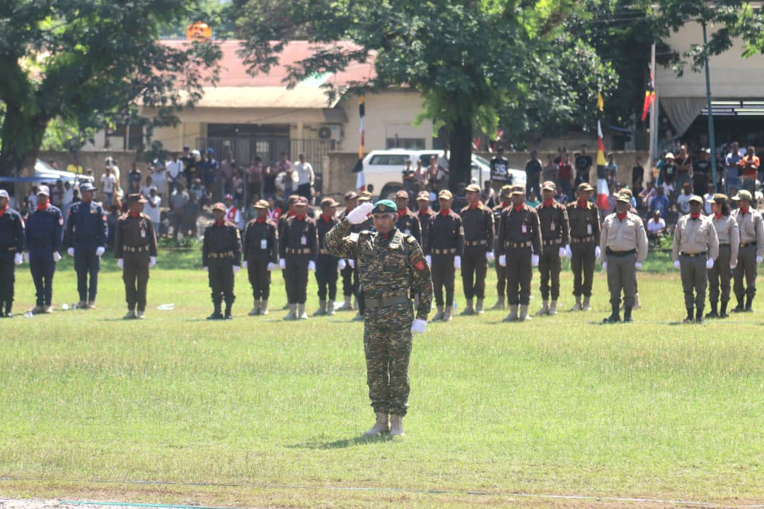 BOBONARO,MJ Sesta-Feira 28 Novembro 2025 Sua-Eselénsia Ministru Justisa, Dr. Sérgio de Jesus Fernandes da Costa Hornai, dezempeña funsaun nu’udár inspetór iha serimónia komemorasaun Loron Proklamasaun Independénsia (28 de Novembru 1975 – 28 de Novembru 2025) ba dala-50, ne’ebé hala’o iha Kampu Gimnásiu Maliana, Munisípiu Bobonaro.